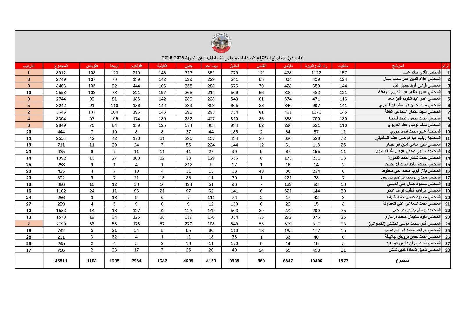 أعلنت لجنة الانتخابات المركزية في نقابة المحامين النظاميين الفلسطينيين انتهاء فرز الاصوات لانتخابات مجلس نقابة المحامين لدورة 2025-2028 التي جرت يوم السبت الموافق 5/7/2025 ، وقد جاءت النتائج كما يلي حسب عدد الأصوات :